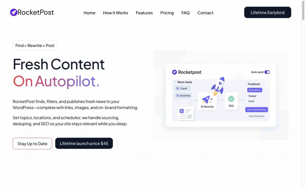RocketPost is a WordPress plugin and companion marketing site that I designed and built end-to-end. The plugin automates a full publishing workflow—discovering relevant news via RSS, rewriting for clarity and SEO, enriching links and media, then publishing on a recurring schedule. The site at RocketPost.pro promotes the product, handles licensing and downloads, and provides docs/FAQs.